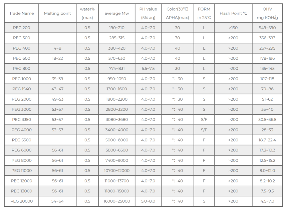 PEG-6000 ve üzeri: Yüksek molekül ağırlıklı, sert katı. Daha yüksek sertliğe ve erime noktasına sahiptir ve genellikle metal işleme yardımcısı, tablet yağlayıcı veya tekstil haşıl maddesi olarak kullanılır ve mükemmel yağlama ve dispersiyon etkileri sağlar.